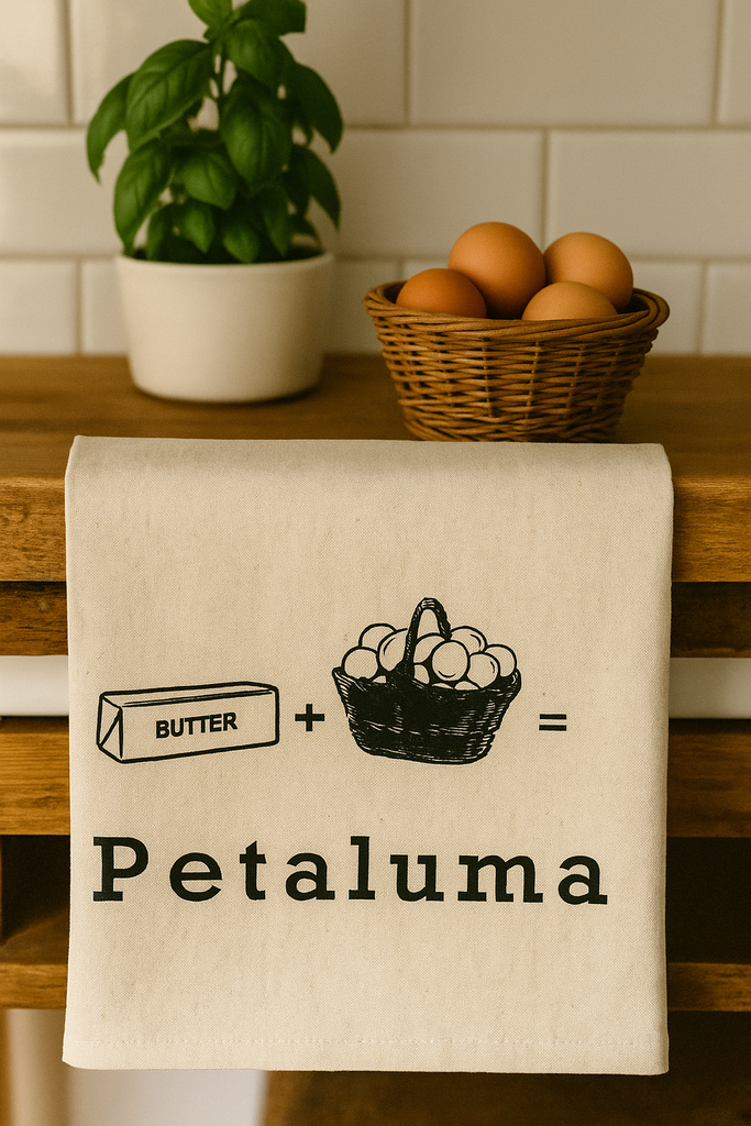 A charming nod to Petaluma’s dairy heritage, this natural cotton tea towel celebrates the city’s “Butter & Eggs” legacy with simple, timeless style. Featuring vintage-inspired illustrations of butter, eggs, and the word Petaluma, it’s perfect for adding a touch of farmhouse character to any kitchen. Lovely as a hostess gift or everyday accent, this towel brings a little piece of Sonoma County home