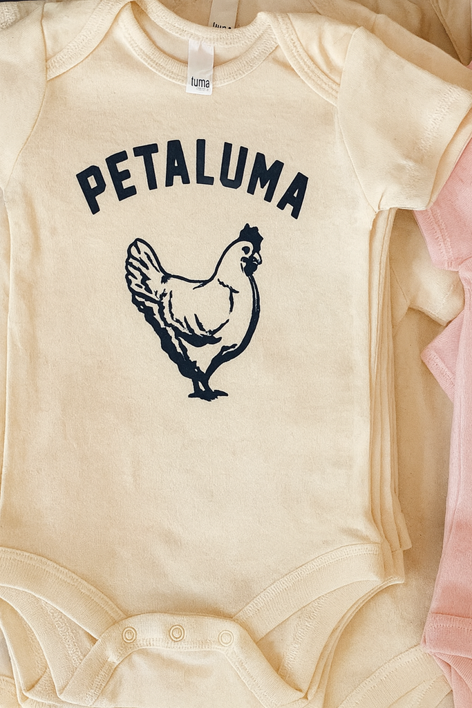 A classic nod to Petaluma’s proud heritage — the Chicken Capital of the World. This natural cotton onesie features our signature hand-drawn chicken graphic and bold “PETALUMA” lettering for a timeless, hometown feel. Made from soft, breathable fabric perfect for everyday wear, it’s as cozy as it is cute. Designed and printed in California, this onesie makes a thoughtful gift for any little local or future farmhand in training.